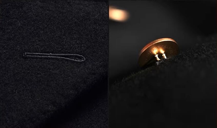 ・ダブルブレストの構造に金ボタンがアクセントとなり、クラシックでありながら現代的な感覚も楽しめるデザインです。シンプルながらも存在感のある一着です。