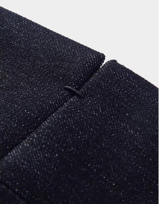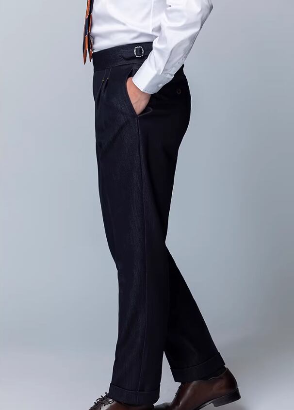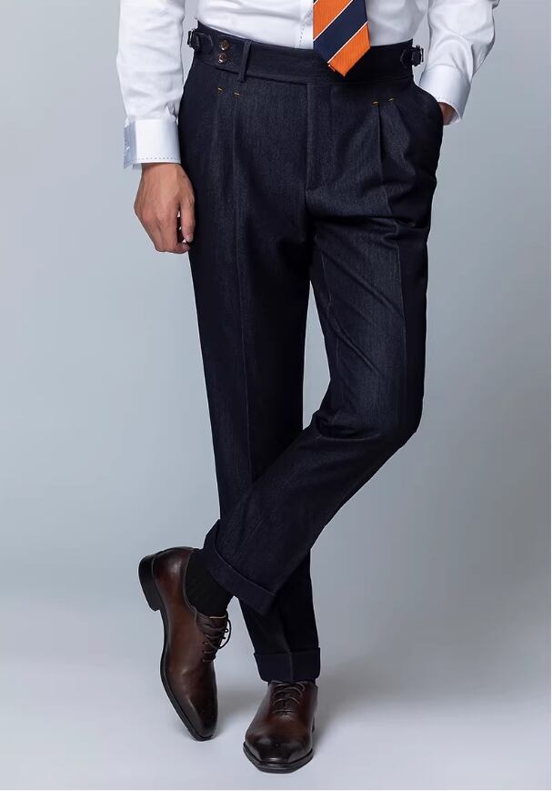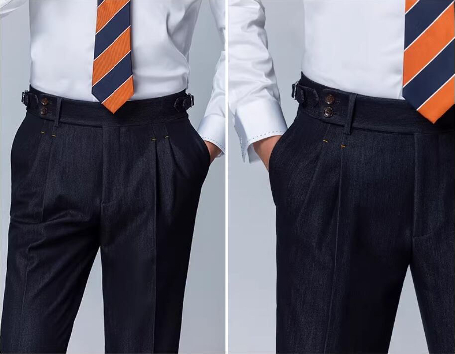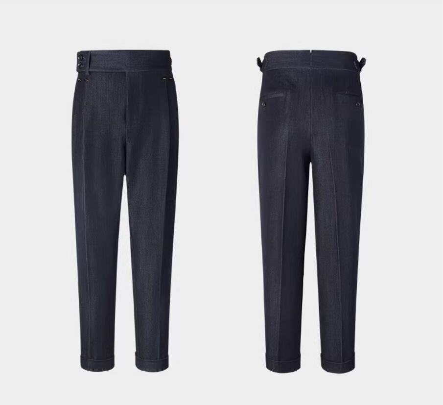 洗練されたビジネスカジュアルスタイルを実現する、ハイウエスト デニム ダブルプリーツ メンズ スラックスが新登場しました。このスラックスは、コットン100%の柔らかな素材を使用し、スリムフィットでありながらストレートなシルエットが特徴です。シンプルでありながら、スタイリッシュな印象を与えるアイテムです。