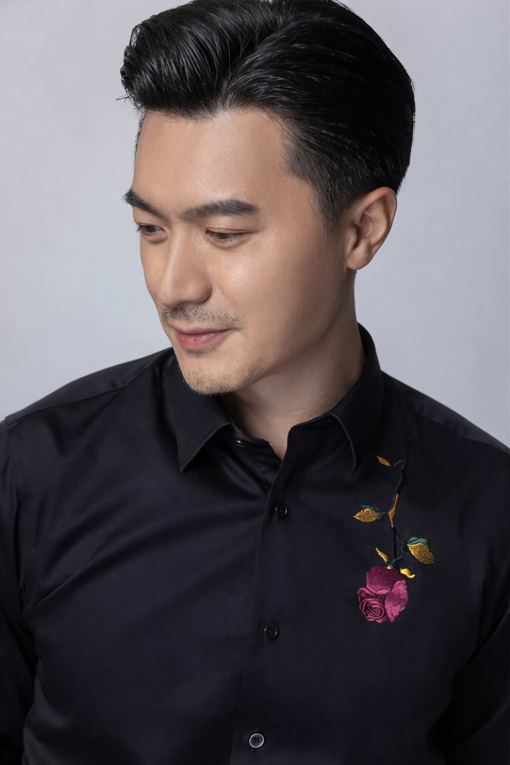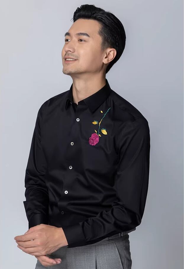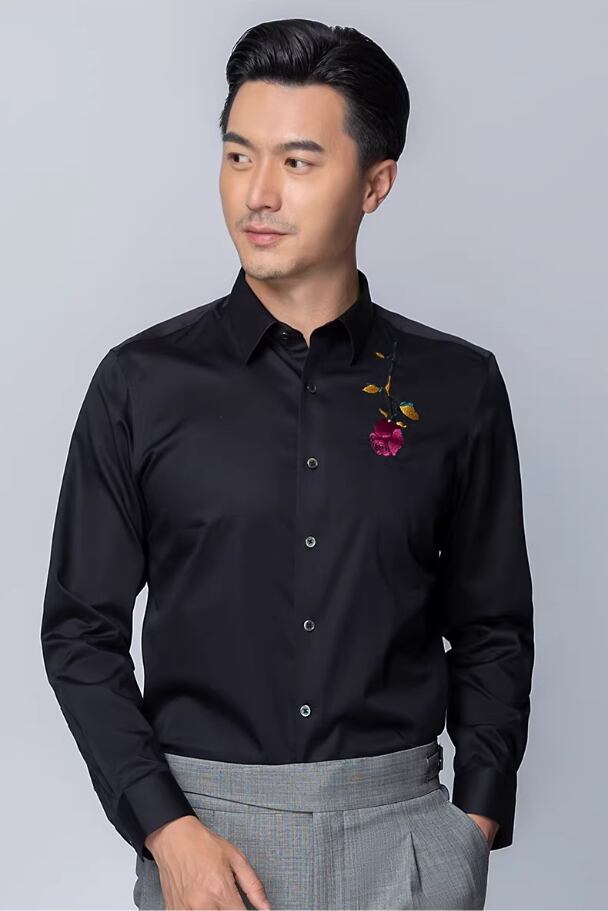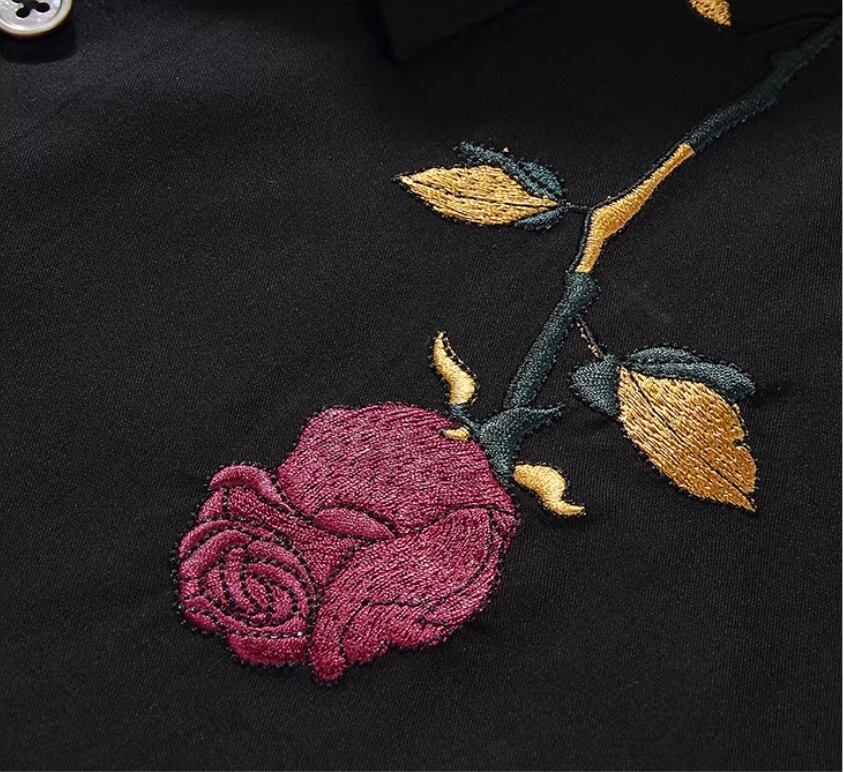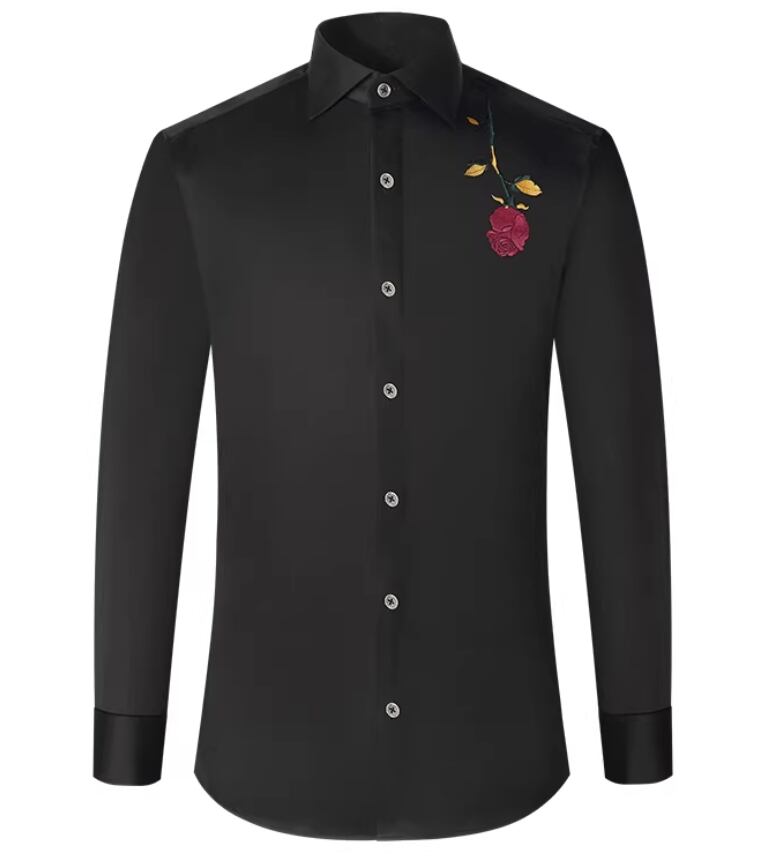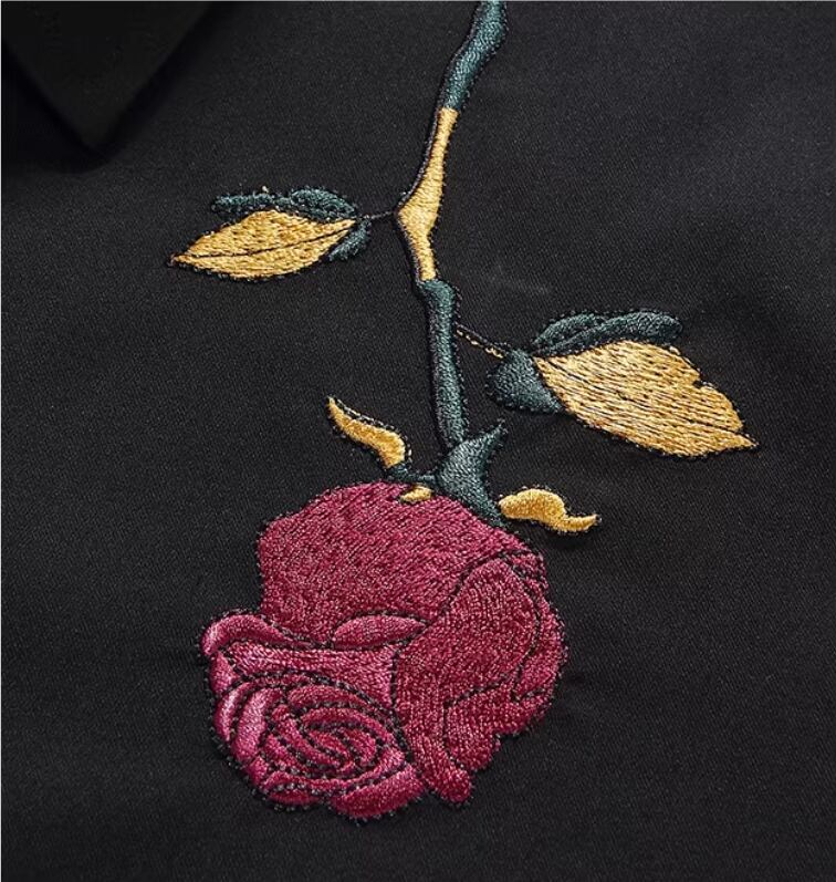 【#10130】ブラックローズ刺繍入り コットン100% スリムフィット ラグジュアリーカジュアルシャツ