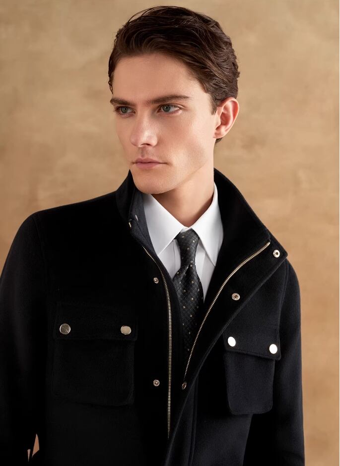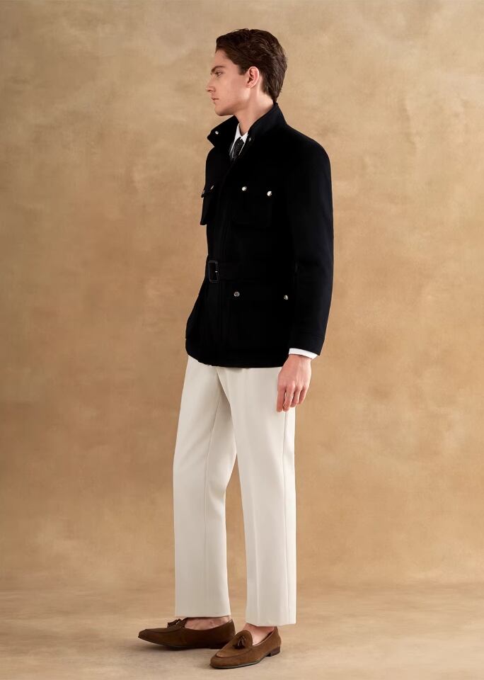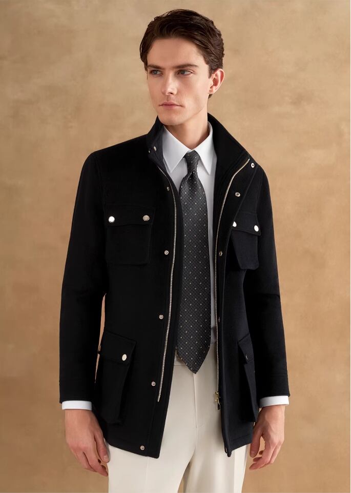 エレガントでありながら機能的、カシミヤ×ウール混 ブラック スタンドカラー ハンティングジャケットが新登場しました。このジャケットは、贅沢なウール70%とカシミヤ30%を使用しており、風を通さない防風性能を備えたアイテムです。オールドマネースタイルを取り入れたデザインは、あなたのコーディネートに特別な輝きを与えます。