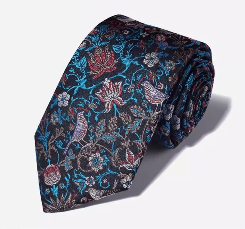 【#10127】メンズ高級ネクタイ ヴィンテージ花鳥柄・先染めシルク100%