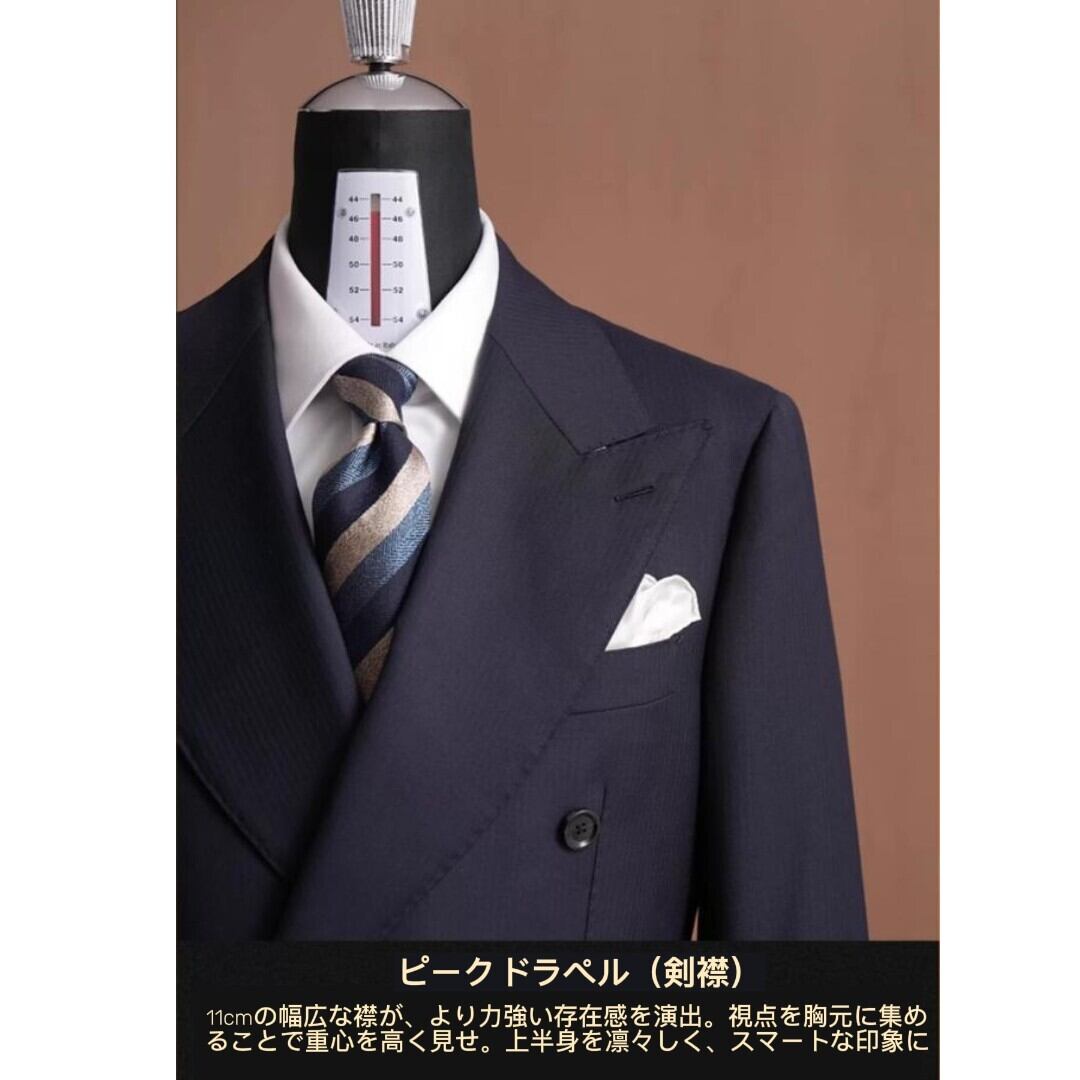 ・襟型ワイドラペル(9〜11cm)は、シャープな印象を与え、フロントの多ボタン・ダブルブレスト仕様が特別感を演出します。半毛芯仕立て(ハーフキャンバス)のため、抜群のフィット感を実現し、スリムフィットのシルエットが洗練されたスタイルを引き立てます。