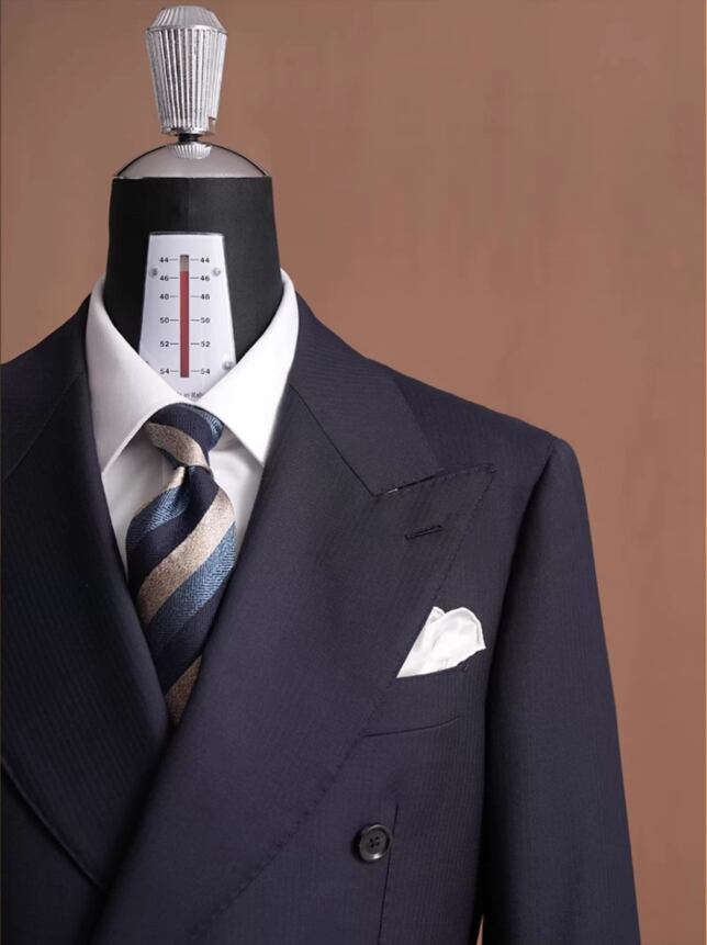 The wide peak lapels (9–11cm) create a sharp, powerful impression, while the multi-button double-breasted front adds an air of exclusivity.