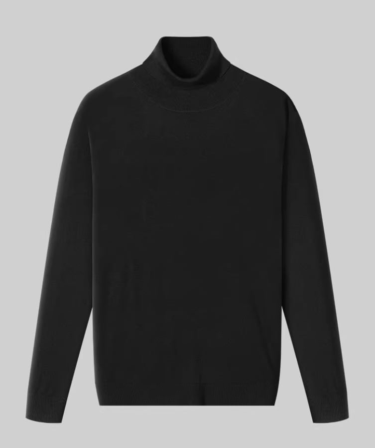 ・クラシックなタートルネックがシルエットを美しく見せ、スタイリッシュな印象を演出します。シンプルでありながら上質感が漂う一着です。