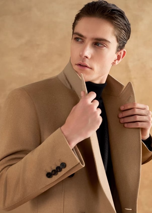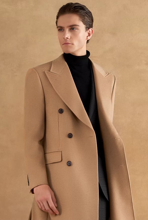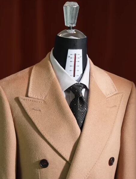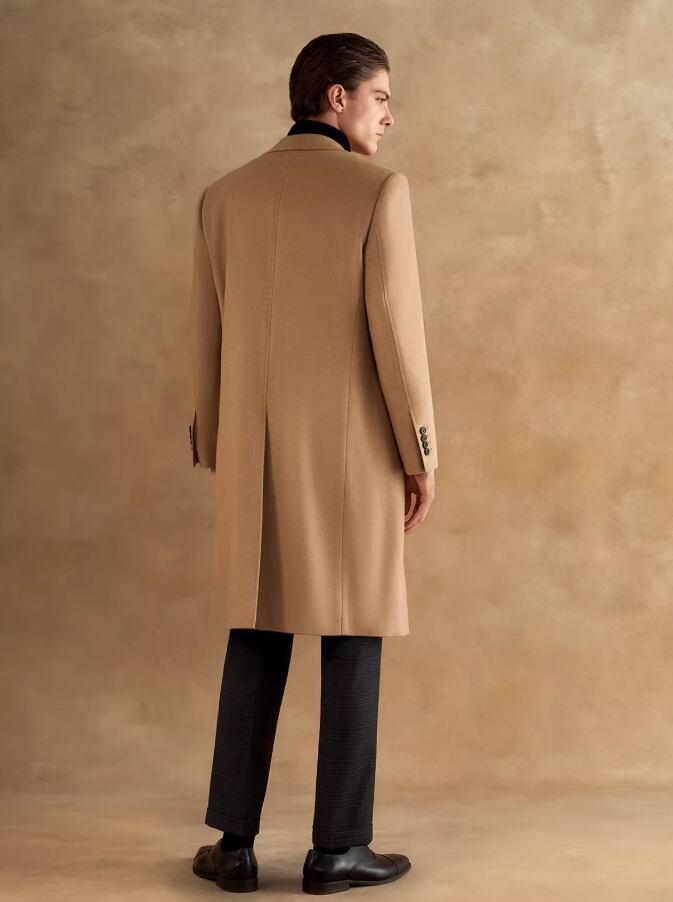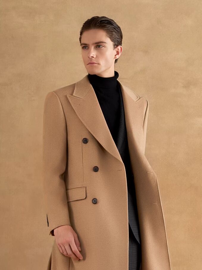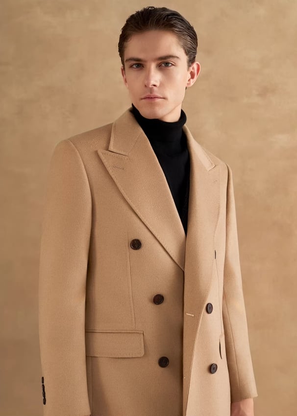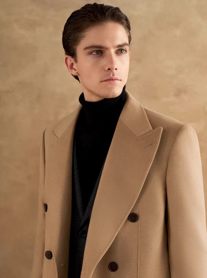 クラシックなダブルブレストとピークドラペルのデザインで凛とした輪郭を描き出し、落ち着きのある堂々としたビジネススタイルを際立たせます。 生地は100%天然のキャメルヘアを厳選し、繊維の中空構造によって暖かさを閉じ込めます。 480Gの目付けは、軽やかな体感と優れた保温性を両立させています。 キャメルカラーは秋冬の決して色褪せないクラシックな色調として、成熟した男性の優雅な気質を引き立てるだけでなく、変幻自在な可塑性も備えています。 ハイネックセーターとスラックスを合わせてフォーマルな場の気品ある高級感を演出するのも、あるいはデニムパンツと組み合わせてカジュアルスタイルを表現するのも、どちらもワードローブにおける理想的な価値ある選択となります。