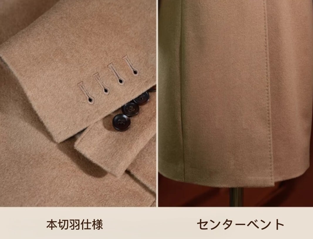 ・センターベント:体型を修飾すると同時に、より大きな活動空間を与えます。また、長時間座ることによるコートのシワを効果的に防ぎます。
