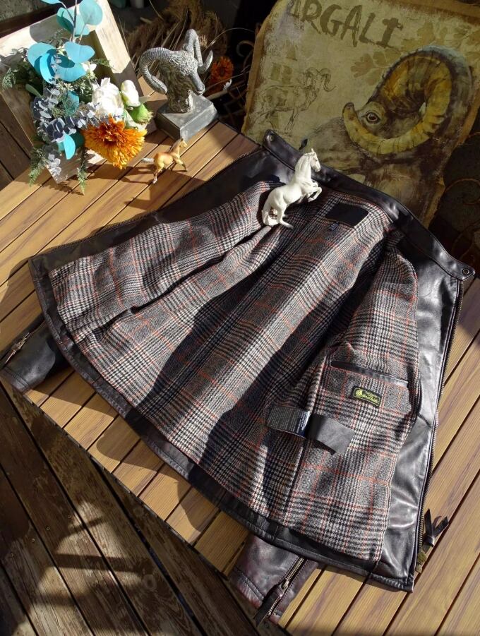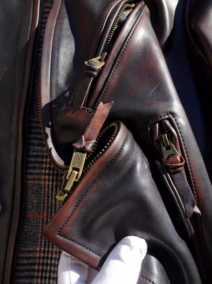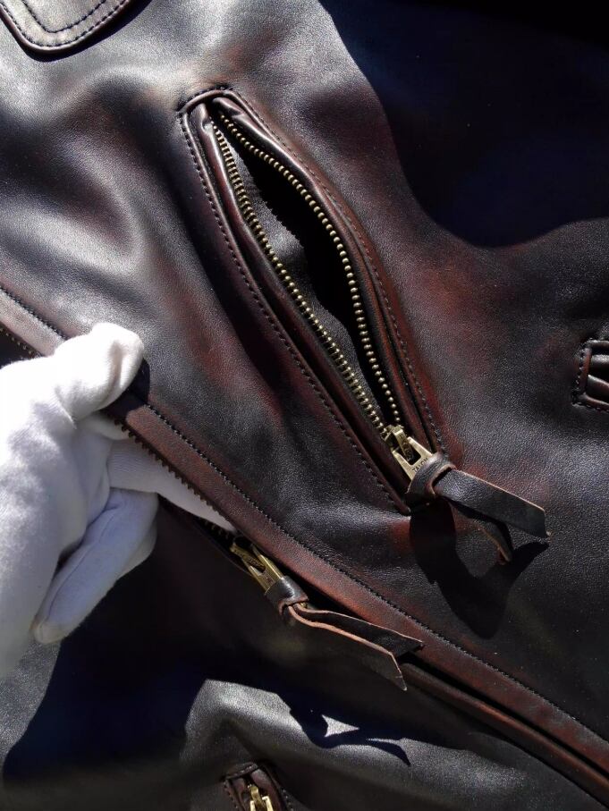 詳細は画像をご確認ください。タイトなフィット感を好まれる方には、サイズダウンをおすすめします。着用を重ねることで革が体に馴染み、より愛着の湧く一着になります。