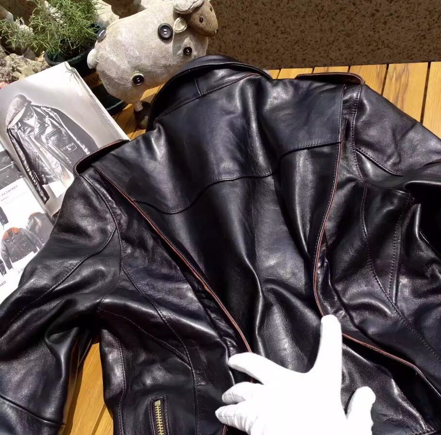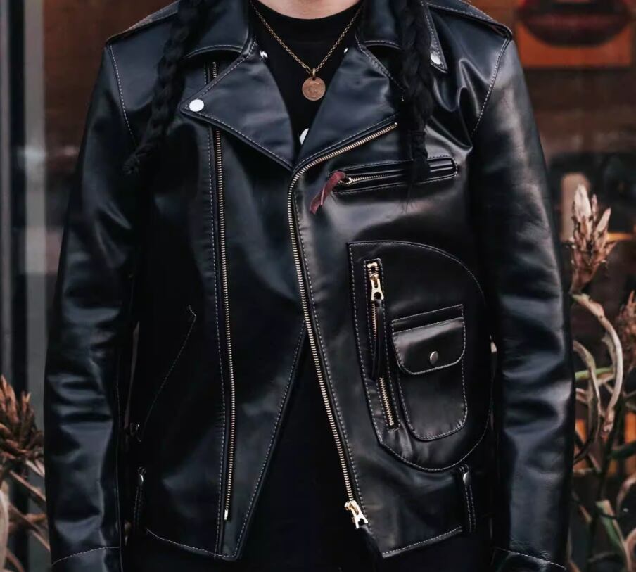 詳しくは画像をご確認ください。タイトなフィット感を好まれる方には、サイズダウンをおすすめします。着用を重ねることで革が体に馴染み、愛着が湧く一着となります。