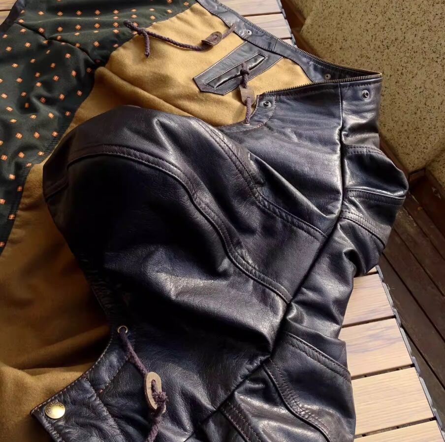 レザー製のフードが、無骨ながらもカジュアルな印象を与えます。