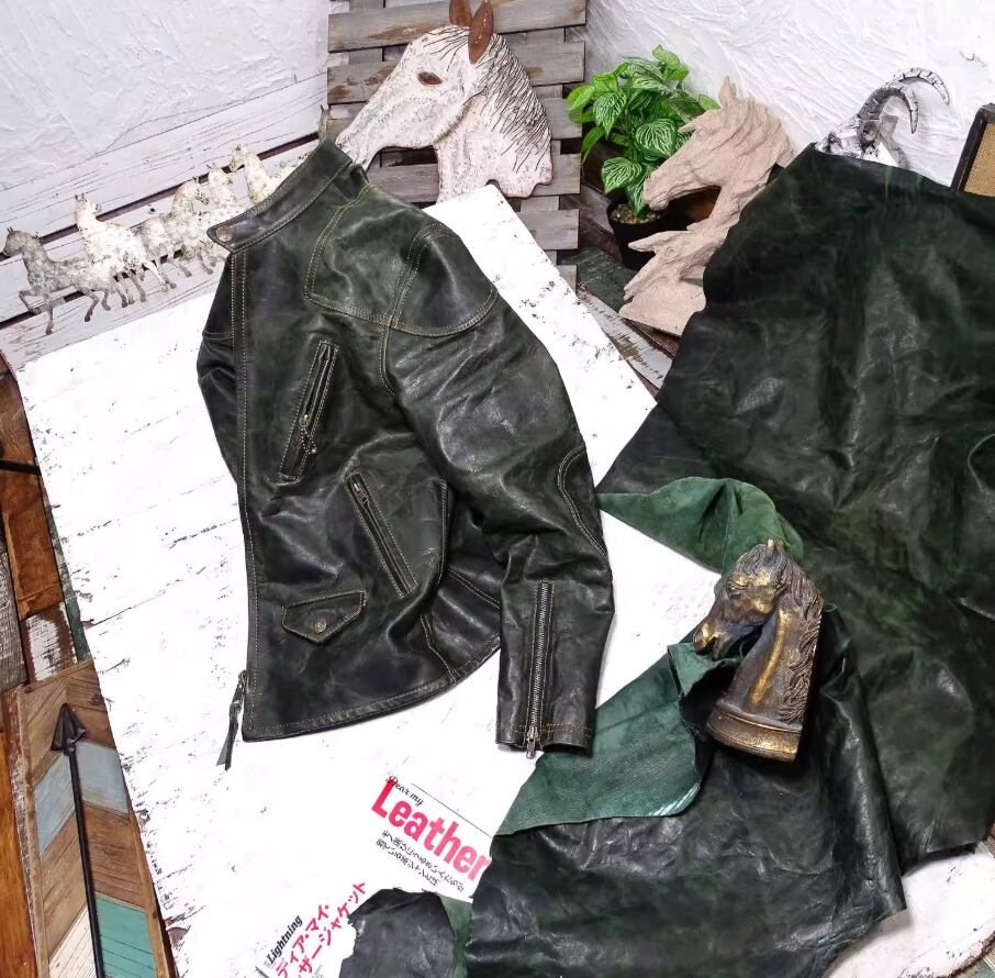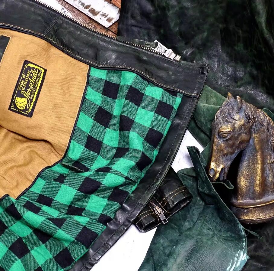 深い歴史を感じさせる色合いのヴィンテージグリーンに仕上げられた、フルベジタブルタンニンで処理されたポニーハイドを使用したデザイン。独自のワックス染めが施され、経年変化を楽しむことができる特別な一着です。