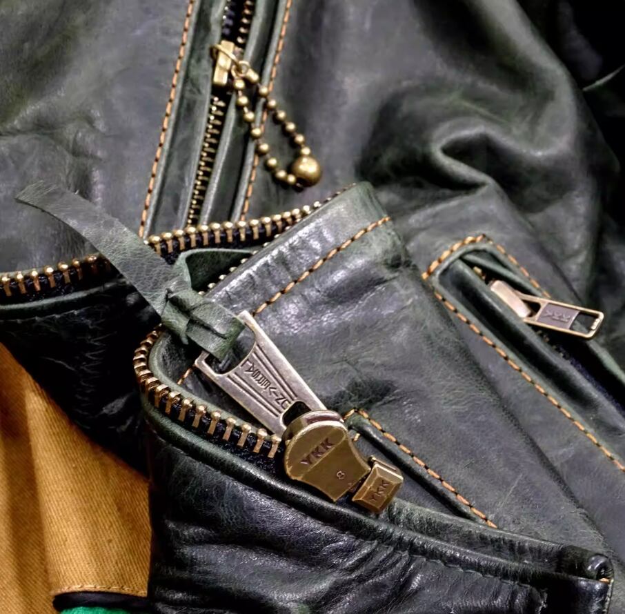 胸ポケット: YKK アンティークブロンズ(5号)ボールチェーンを採用。クラシックなライダースの象徴的なディテール。