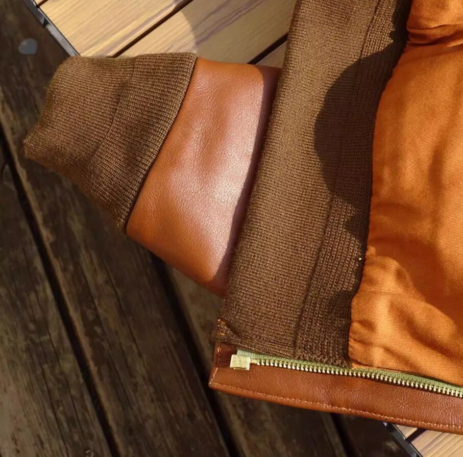 キャラメルブラウン: 深みがありながらも鮮やかな、高級感漂う焦がし茶色。着込むほどに革の表情が豊かになり、自分だけのエイジングを楽しめます。