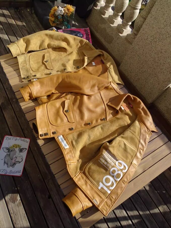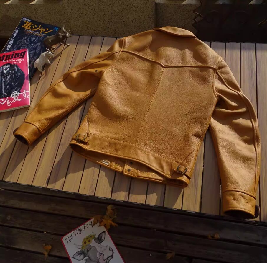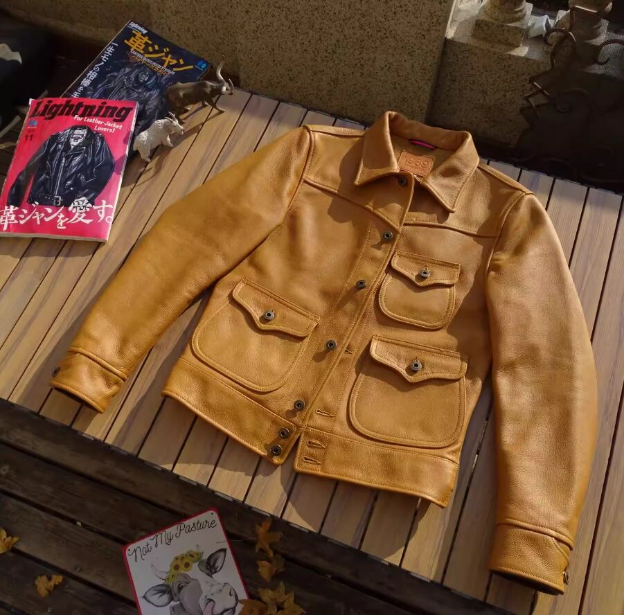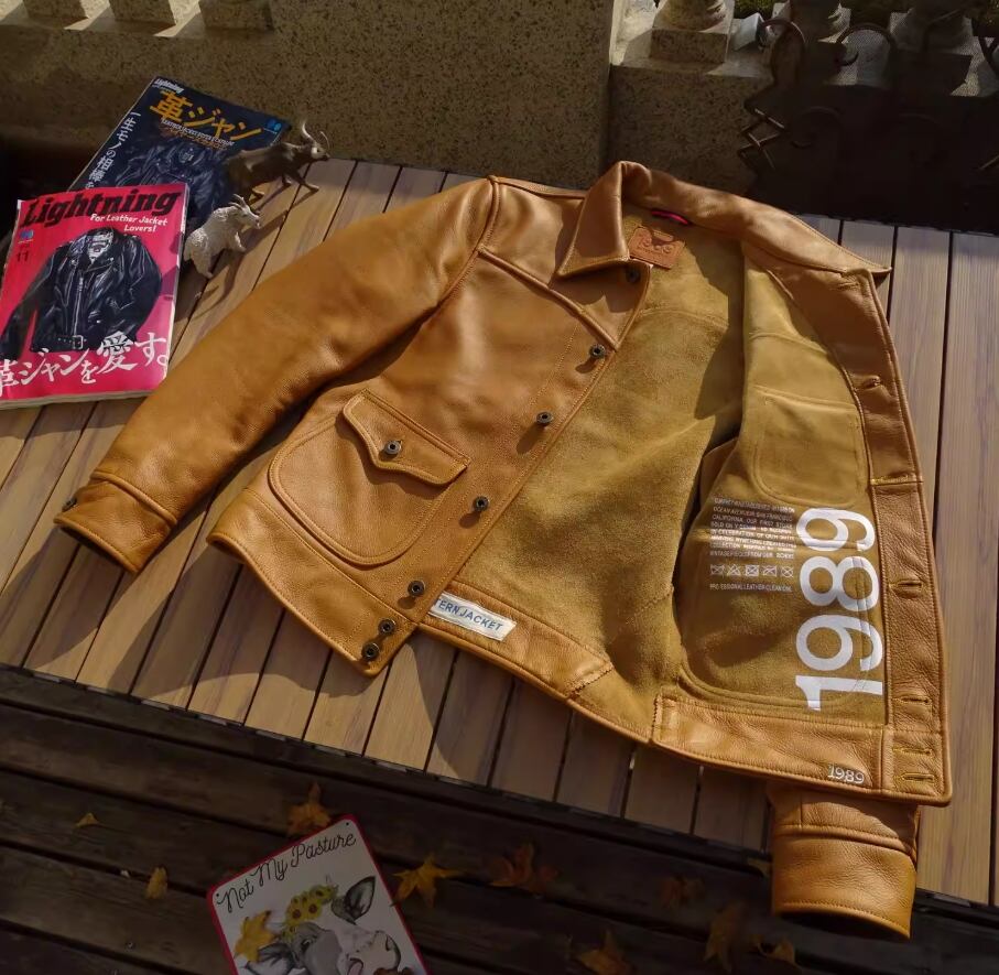革の表も裏も、すべてが「主役」。裏地を一切使わない「無裏地(アンラインド)」という贅沢な選択。イタリア産カウハイドの圧倒的な質感と、ヴィンテージ感漂う「サンセットイエロー」が融合した、一生モノと呼ぶにふさわしいデニムジャケット型レザージャケットです。