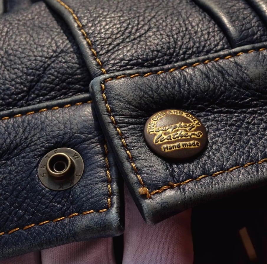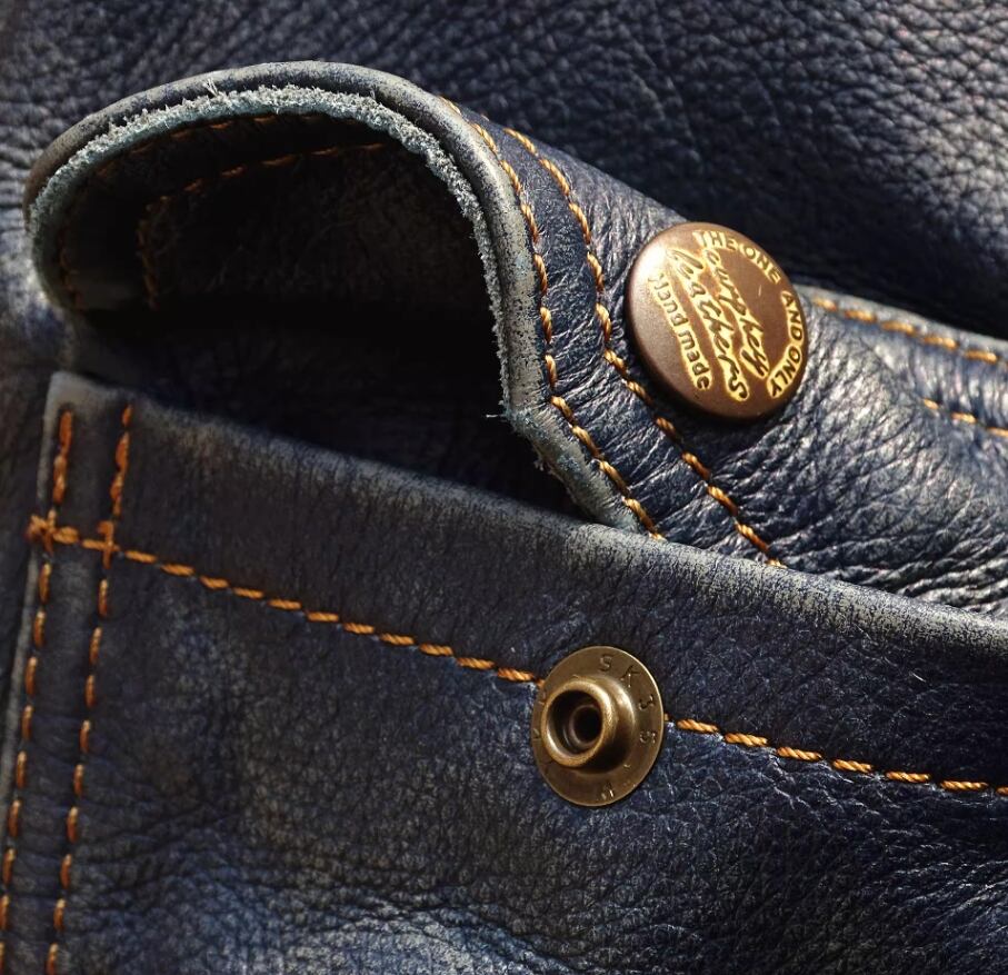 YKKアンティークブロンズ: フロントボタンや細部の金具には、インディゴの革色に最もマッチするYKK製のアンティークブロンズパーツを採用。