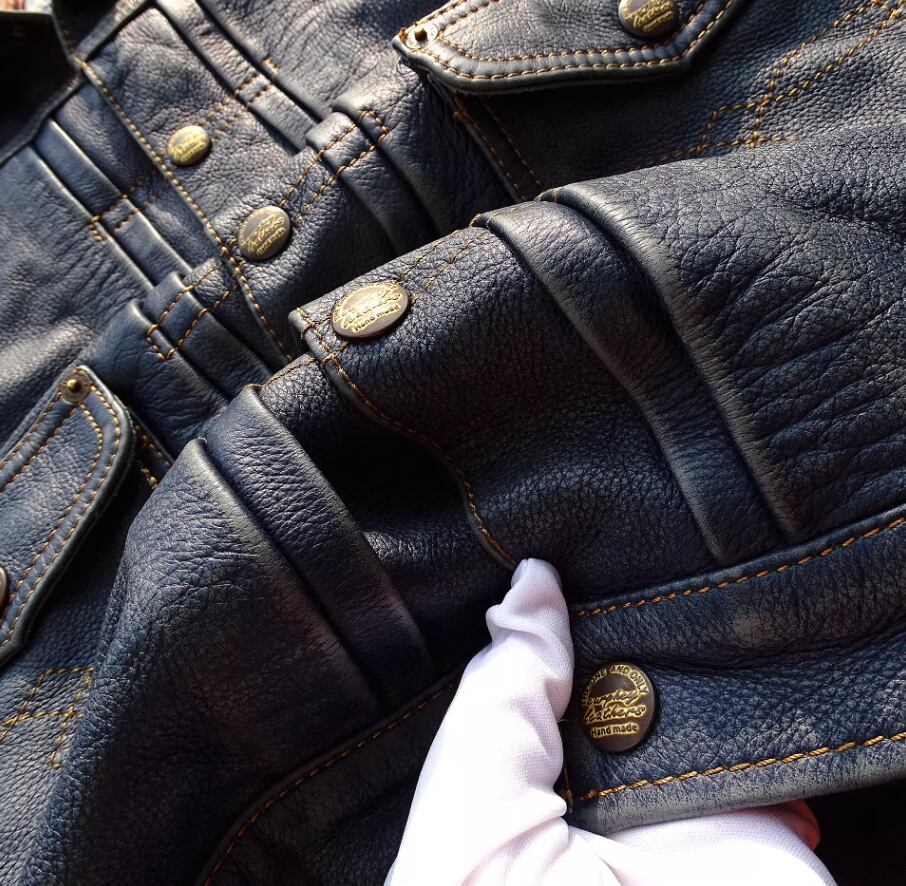 中古加工: 特殊なストーンウォッシュを施すことで、革の端やシワ部分に絶妙なアタリを出し、長年着古したようなリアルなヴィンテージ感を再現しました。