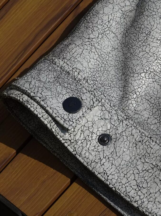 上質な山羊革の表面に、繊細かつ大胆なひび割れ(クラック)加工を施しました。使い込むほどにクラックの間から下地の風合いがのぞき、ヴィンテージの彫刻のような奥行きのある表情へと変化します。