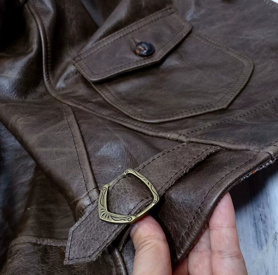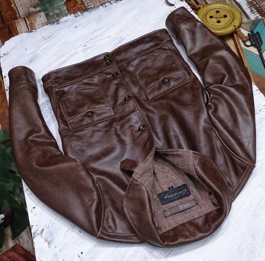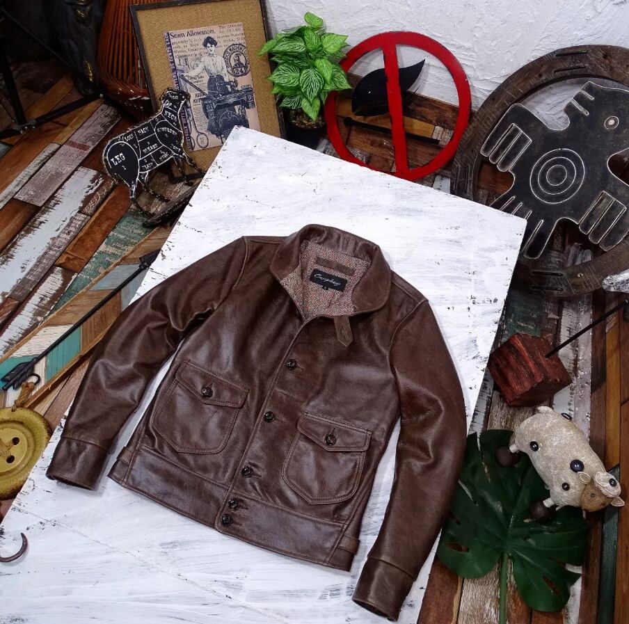 1920年代から30年代にかけて、アメリカの紳士たちに愛された「コサックジャケット」を現代に復刻。アメリカから輸入された極上の「油浸ロウ変牛革(オイルド・プルアップレザー)」を贅沢に使用し、ショールカラーが醸し出す知的な無骨さを表現しました。