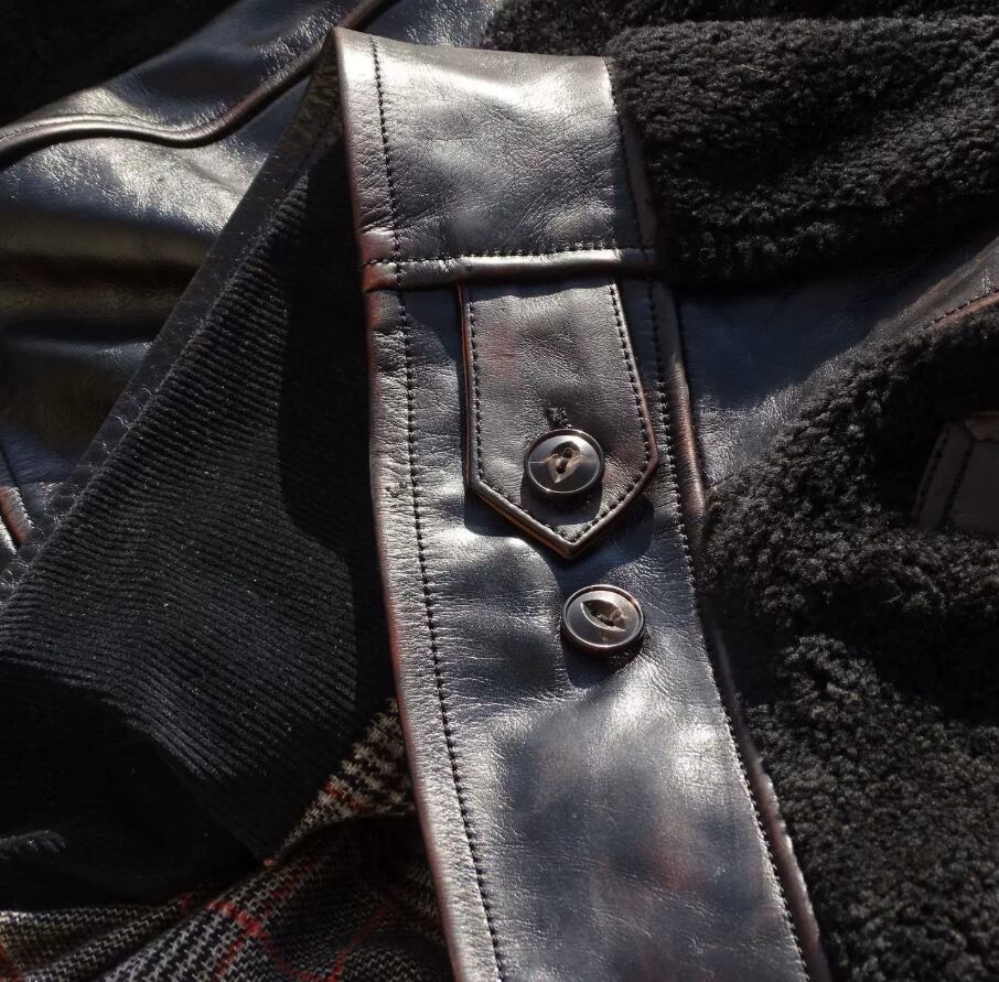 袖や各パーツには、イタリアで丁寧に鞣された茶芯ホースハイドを採用。表面のブラックが摩耗することで、下地のブラウンが浮かび上がるエイジングは、ヴィンテージ愛好家にとって最大の悦びです。イタリアンレザーらしい、しなやかさと力強さを兼ね備えています。