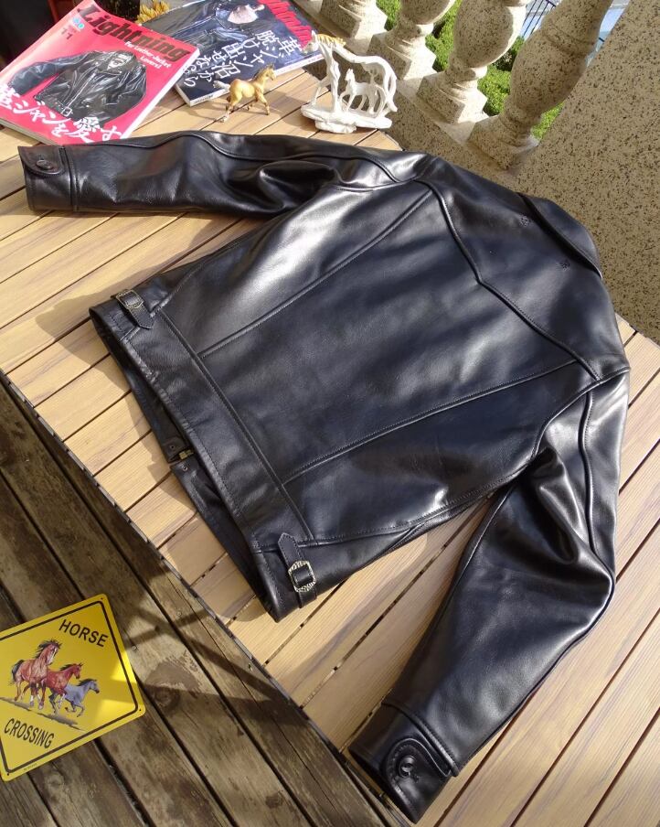 厳選されたトップレイヤーのホースハイドを使用。最初は鎧のような手応えを感じる「硬質」な仕上がりですが、着込むほどにオーナーの動きに合わせて深いシワが刻まれ、自分だけの一着へと成長していきます。